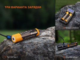 Аккумулятор поддерживает три различных варианта зарядки: с помощью зарядного устройства, через порт Type-C фонаря Fenix, а также через собственный встроенный порт Type-C. Универсальность зарядки обеспечивает удобство использования в любых условиях.