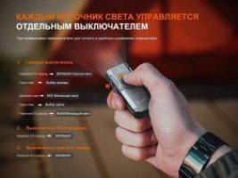Для переключения режимов предусмотрены три отдельные кнопки. Центральная позволяет регулировать белый, красный и синий свет, а боковые переключатели отвечают за выбор режима лазерной указки и ультрафиолетового света.