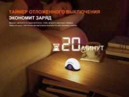 Если движение прекращается, встроенный таймер отложенного выключения не гасит свет сразу - фонарь продолжает светить около 60 секунд, после чего выключается. Такой фонарь особенно удобен для палатки и кемпинга в целом: свет не пропадает внезапно и при этом экономится заряд фонаря с аккумулятором.