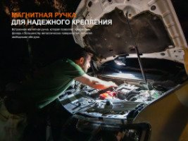 Главная конструкционная особенность - магнитная ручка, вращающаяся на 360°, которая упрощает крепление фонаря к автомобилю, металлоконструкциям или инструментам.