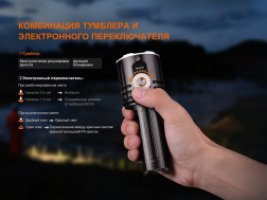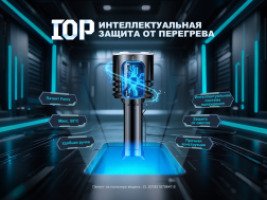 Управление реализовано с помощью тумблера и электрического переключателя — все продумано так, чтобы фонарем можно было легко пользоваться даже в перчатках. Система запоминает последний режим работы и защищена от случайного включения, а встроенный датчик автоматически снижает яркость при перегреве или близком препятствии.