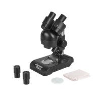 Портативный стереоскопический микроскоп начального уровня для наблюдений в проходящем и отраженном свете. Увеличение 20х. Объемное изображение. Два встроенных светодиодных осветителя- проходящего и отраженного света. Питание: три батареи АА (4,5 В).