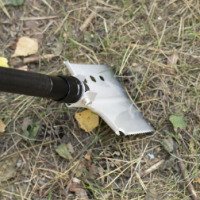 Черенок складывается из четырех элементы общей длиной 118 сантиметров, которая оптимальна для комфортного использования человеком среднего роста. Удлинители изготовлены из облегченного алюминия – прочного материала, который не покрывается ржавчиной, выдерживает механические повреждения без образования деформаций и отличается невосприимчивостью к воздействию солей и кислот. Алюминий широко используется в производстве инструментов для туризма и активного отдыха, поскольку он не темнеет при длительном контакте с влагой и обладает малым весом, что особенно важно в походных условиях. Удлинители крепятся друг к другу с помощью резьбы, и пользователь может сам регулировать необходимую длину черенка, используя сразу все или только несколько элементов.
