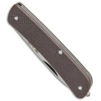 Рукоятка сформирована из стальной базы и двух накладок из композитного материала (его название – G10). Она может быть любого из трех цветов: черная, коричневая или зеленая. Чтобы нож не проскальзывал в ладонях, накладки сделаны текстурированными. С одной стороны прикручена стальная клипса, которая позволяет крепить нож на ремне.