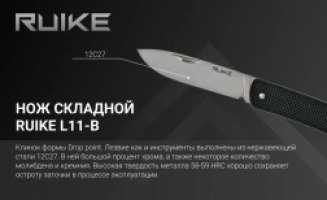 Основным материалом для изготовления Ruike L11 является сталь 12С27. Именно из нее и сделаны все инструменты. Эта сталь изготавливается в Швеции и закаляется при низких температурах. Она считаеся одной из лучших в ножевой индустрии, поскольку обладает сразу двумя важными для качественного ножа свойствами. Во-первых, сплав является нержавеющим, а потому сделанные из него ножи так хорошо подходят для туризма и других случаев, когда постоянно следить за состоянием клинка бывает затруднительно. Во-вторых, данный тип стали отлично сохраняет заточку за счет высокой твердости, которая достигает 57-59 HRC.