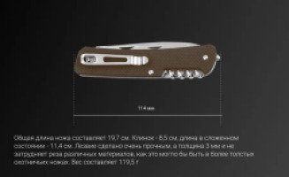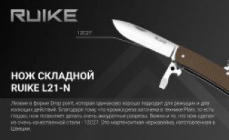 Ruike L21 – это один из складных ножей молодого, но уже хорошо известного бренда Ruike. Он адресован всем активным людям, которые часто выезжают на природу для отдыха или занятий спортом. Главным преимуществом данной модели является компактность, которая совершенно не снижает практичность ножа. Ruike L21 наделен 12 функциями, которые детально описаны в инструкции, составленной производителями. Но все же, его главным инструментом является именно нож. Длина лезвия складного ножа составляет 85 мм. Оно имеет форму drop-point – универсальную разновидность, которая позволяет одинаково легко резать ножом и колоть. К тому же, заточено лезвие тоже универсальным способом – ровно по всей его длине. Толщина клинка Ruike L21 составляет 3 мм. Нож сделан из стали 12С27, которая относится к числу нержавеющих сплавов. Этот тщательно сбалансированный металл характеризуется большой твердостью (до 59 HRC), что позволяет ножам долго оставаться острыми даже при интенсивном использовании. Из такого же металла сделаны и все другие инструменты данной модели. Из спинки рукоятки достается штопор, а параллельно ножу размещен многофункциональный инструмент с функциями плоской отвертки, открывалки для бутылок, приспособлениями для зачистки проводов разного диаметра. Как и лезвие ножа, этот инструмент достается при помощи насечки на стальной пластине, которую можно поддеть ногтем. Помимо этого, с обратно1 стороны рукоятки достается инструмент для разрезания ремней и строп, который также может послужить маленькой прямой отверткой. В торцевую часть рукоятки встроено небольшое поворотное кольцо, в которое можно продеть темляк. Кроме того, здесь же находится стеклобой. Рядом с последними двумя инструментами хранится пинцет, который плотно размещается внутри рукоятки, однако может использоваться как совершенно самостоятельный инструмент.