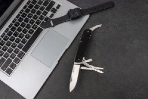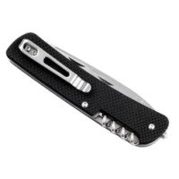 Помимо режущего клинка, с той же стороны рукоятки можно достать миниатюрные ножницы или инструмент, совмещающий в себе сразу несколько функций. Это открывалка для бутылок, прямая отвертка шириною 6,5 мм, два инструмента для зачистки от изоляции любых проводов. С противоположной стороны рукоятки достается шило-развертка с отверстием для нитки, которое сделано заточенным с одной стороны. Этот же инструмент может использоваться как маленький гаечный ключ. Отдельно сделан инструмент для перерезания строп, на конце которого имеется узкая (3 мм) прямая отвертка. Непосредственно в торец рукоятки встроен стеклобой и небольшое стальное кольцо для темляка. Здесь же размещены щипцы, которые можно полностью достать из рукоятки и использовать как совершенно самостоятельный инструмент. А на спинке рукоятки имеется штопор.