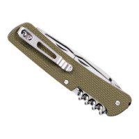 Однако владельцы модели Ruike L42 в любой момент могут воспользоваться не только ножом. Помимо этого к их услугам также обширный комплект дополнительных инструментов. Рядом с ножом помещаются ножницы уменьшенного размера, пила по дереву, открывалка для бутылок, небольшая отвертка с прямым шлицем шириною 6,5 мм, два приспособления для снятия изоляции с проводов. С противоположной стороны рукоятки таким же образом достается широкое шило с ушком для нитки и еще двумя приспособлениями для зачистки проводов. Непосредственно в торцевой части встроен стеклобой и можно достать металлическое кольцо, к которому крепится темляк. Также здесь размещаются щипцы, которые, в отличие от всех прочих инструментов, можно использовать отдельно от ножа. А на верхней стороне рукоятки располагается штопор.