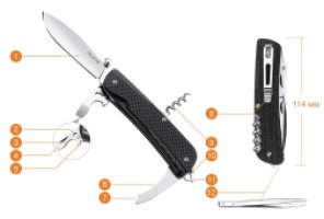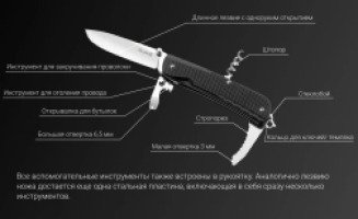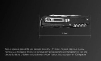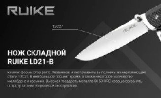 Ruike LD21 – это складной нож с отличным набором функций. Он располагает целым комплектом дополнительных инструментов, встроенных в рукоятку наподобие самого лезвия ножа. Все эти инструменты изготовлены из качественной нержавейки шведского производства. Используемая марка стали называется 12С27. Она известна тем, что при хорошей сопротивляемости коррозии также обладает большой твердостью – около 59 HRC, а потому ножи не приходится часто точить.