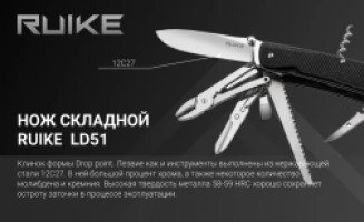 Модель Ruike LD51 объединила максимальное для своей серии количество инструментов. Как и сам нож, они размещены в нутрии одной общей рукоятки. Таким образом, все инструменты постоянно находятся под рукой и Ruike LD51 сможет выручить своего владельца практически в любой ситуации. Это нож особенно хорошо подходит туристам и рыбакам, которым срочный ремонт того или иного снаряжения может понадобиться прямо на природе.