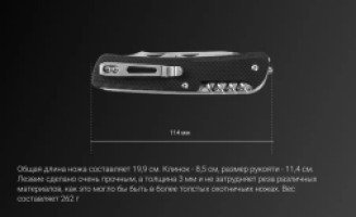 Наиболее важным инструментом в Ruike LD51 является именно нож. Он сделан удобным для выполнения большинства видов работ, подходит для обычных разрезов и колющих надрезов. Размер клинка в длину составляет 85 мм, а запас прочности создается за счет толщины обуха 3 мм. Чтобы сделать это лезвие универсальным, производители гладко его заточили (согласно технике plain). Кроме того, нож очень тщательно отшлифован. Открыть клинок не составит труда даже одной рукой, для чего нужно использовать закрепленный на нем шпенек. А чтобы работать под нагрузкой было как можно более безопасно, в нож установлен один из лучших замков – Liner lock. Он нужен, чтобы фиксировать лезвие в его крайнем положении, то есть – открытым. Таким образом, нож не сможет сложиться под нагрузкой.