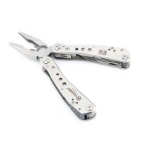Мультитул G201-H выполнен в серебристом цвете и отполирован в «зеркало». Рельефные вставки по бокам рукояток обеспечивают надежный хват даже если руки влажные. Аккуратные отверстия и гравировка с логотипом делают мультитул визуально интереснее и придают ему технологичный вид.