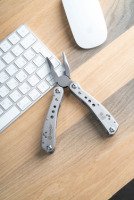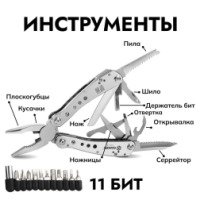 Центральный элемент мультитула — подпружиненные плоскогубцы. Они автоматически возвращаются в исходное положение после сжатия, что упрощает использование и снижает усталость рук во время работы с инструментом. Плоскогубцы отлично справляются с удерживанием мелких деталей, перекусыванием проволоки и монтажом крепежных элементов. В набор бит входят 5 шестигранников, 3 плоских отвертки и 3 крестовых. Насадки крепятся к держателю с помощью магнитного переходника, поэтому биты не болтаются и не выпадают во время работы.