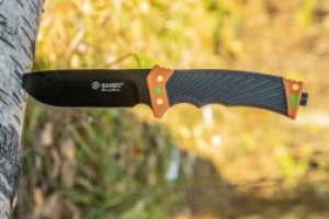 Модель G8012V2-OR продумана с учетом специфики ножей для использования на природе. Лезвие изготовлено из высокоуглеродистой стали 8CR13, которая устойчива к появлению коррозионного налета при длительном воздействии влаги и обеспечивает качественный рез. Твердость стали достигает отметки 58 HRC — оптимальное значение, при котором клинок легко затачивается и надолго сохраняет остроту режущей кромки. Длина клинка составляет 11.3 сантиметра, а толщина — 5 миллиметров, что гарантирует повышенную прочность ножа и исключает вероятность появления сколов. Поверхность лезвия имеет черное матовое покрытие, которое отличается стойкостью и является отличительной чертой модели.