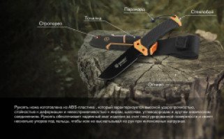Нож Ganzo G8012V2-OR идет в комплекте с фирменными ножнами, которые изготовлены из ударопрочного пластика и нейлона. Инструмент фиксируется внутри за счет прочной липучки. Чехол имеет ряд интересных дополнений, которые могут пригодиться вдали от цивилизации: компактное огниво, при помощи которого можно высечь искры для разжигания огня, встроенная пластина с алмазным напылением для быстрой заточки лезвия и острый стропорез.
