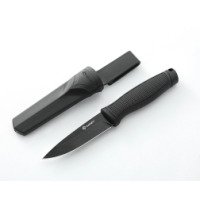 Общая длина походного ножа составляет 217 мм, длина клинка — 98 мм, длина рукояти — 119 мм, толщина клинка — 2,3 мм, а вес — всего 88,5 г, что делает его компактным и удобным в переноске. Рукоять выполнена в практичном черном цвете. В комплект входят ножны из прочного полипропилена, которые позволяют удобно носить нож на поясе или в снаряжении. Форма ножен позволяет закрепить их на ремне и держать под рукой.