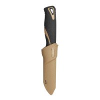 В изготовлении рукоятки применен материал PP+TRP. Этот материал представляет собой сочетание синтетического полипропилена и прорезиненного покрытия. Сочетание этих материалов известны своей износостойкостью и хорошим сопротивлением к воздействию температур. Рукоятка имеет ребристую поверхность, благодаря чему она не скользит в руке, даже при длительном применении. В рукоятку встроена выемка для темляка и добавлены насечки перед частью с лезвием для удобного расположения большого пальца. Ножны также изготовлены из полипропилена, только без добавления резины.