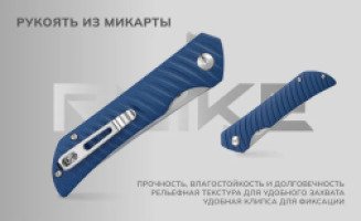 Эргономичная рукоятка обеспечивает удобный и надежный захват, благодаря которому вы можете использовать нож длительное время, не уставая. Рельефный узор не позволяет ножу выскользнуть из руки при использовании в перчатках или во время дождя. Рукоять выполнена из микарты — это современный композитный материал на основе полимерной смолы. Он обладает высокой прочностью, влагостойкостью и долговечностью, а также не впитывает запахи и может противостоять резким перепадам температур.