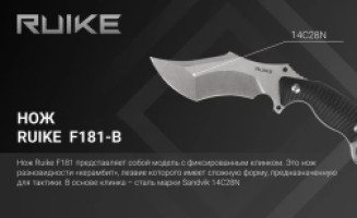 Нож Ruike F181 представляет собой модель с фиксированным клинком. Это нож разновидности «керамбит», лезвие которого имеет сложную форму, предназначенную для тактики. Экземпляр представлен в двух вариантах цвета, чёрном и песочном. Модель базируется на уже знакомом потребителям ноже P881, складного типа.