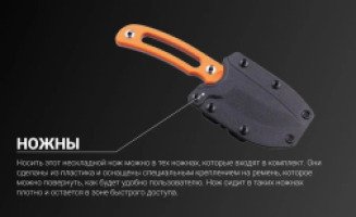 Носить этот нескладной нож можно в тех ножнах, которые входят в комплект. Они сделаны из пластика и оснащены специальным креплением на ремень, которое можно повернуть, как будет удобно пользователю. Нож сидит в таких ножнах плотно и остается в зоне быстрого доступа.