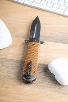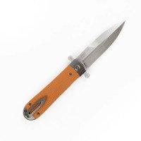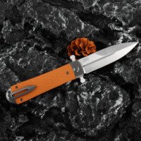 Нож Adimanti by Ganzo Samson – это компактный флиппер, чей клинок надежно запирается в открытом и закрытом положениях. Рукоять инструмента имеет стальную основу с двумя текстурированными накладками из G10 – прочного стеклотекстолита, который высоко ценится за свою стойкость к ударам и механическим повреждениям. В отличие от дешевого пластика, на стеклотекстолите не образовываются микротрещины после продолжительного воздействия низких температур. Материал также не деформируется в случае долгого нахождения под прямыми лучами солнца, не выцветает и не скользит в ладони.