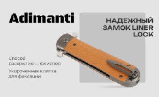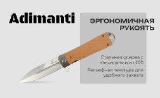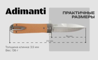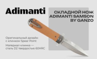Нож Adimanti Samson имеет визуальное сходство с копьем благодаря симметричному клинку. Изделие рассчитано на использование как в городских, так и полевых условиях, поскольку оно имеет компактные габариты для комфортного ношения в кармане и обладает высокой стойкостью к воздействию агрессивных сред, в особенности ряда кислот и обычной влаги.
