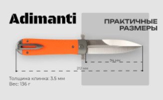 Нож Adimanti Samson имеет визуальное сходство с копьем благодаря симметричному клинку. Изделие рассчитано на использование как в городских, так и полевых условиях, поскольку оно имеет компактные габариты для комфортного ношения в кармане и обладает высокой стойкостью к воздействию агрессивных сред, в особенности ряда кислот и обычной влаги.