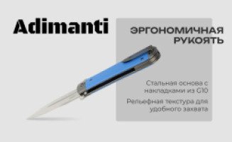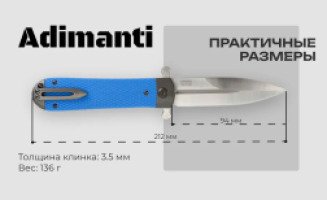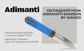 Нож Adimanti Samson имеет визуальное сходство с копьем благодаря симметричному клинку. Изделие рассчитано на использование как в городских, так и полевых условиях, поскольку оно имеет компактные габариты для комфортного ношения в кармане и обладает высокой стойкостью к воздействию агрессивных сред, в особенности ряда кислот и обычной влаги.
