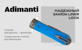Нож Adimanti by Ganzo Samson – это компактный флиппер, чей клинок надежно запирается в открытом и закрытом положениях. Рукоять инструмента имеет стальную основу с двумя текстурированными накладками из G10 – прочного стеклотекстолита, который высоко ценится за свою стойкость к ударам и механическим повреждениям. В отличие от дешевого пластика, на стеклотекстолите не образовываются микротрещины после продолжительного воздействия низких температур. Материал также не деформируется в случае долгого нахождения под прямыми лучами солнца, не выцветает и не скользит в ладони.