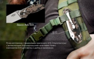 Цвета модели – черный, камуфляж и серый. Создатели позаботились о вкусе ценителей темной гаммы, слегка разбавив ее оригинальной камуфляжной расцветкой. Ручка изготовлена с применением практичного G10. Стеклотекстолит с великолепными пользовательскими качествами: прочный, износостойкий, термостойкий, хорошо поддается окрашиванию. С таким материалом в составе нож обретает защищенность от воздействий внешней среды, становясь по-настоящему безотказным в любой ситуации и условиях. Ножи с компонентом G10 долговечны и удобны в применении. Слегка шероховатая поверхность ручки обеспечивает более комфортный захват – нож надежно ложится в ладонь, не скользит и не смещается.