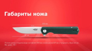 Нож штатно укомплектован съемной стальной клипсой и в торцевой части рукояти имеет отверстие под установку темляка. Размеры ножа имеют оптимальное значение для повседневного ношения инструмента с собой. Его полная длина в открытом виде составляет 20,5 см.