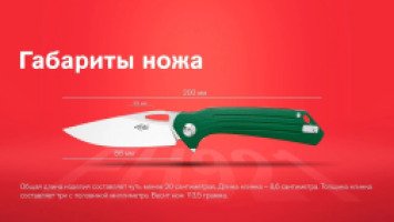 Общая длина изделия составляет чуть менее 20 сантиметров. Длина клинка – 8,6 сантиметра. Толщина клинка составляет три с половиной миллиметра. Весит нож 113,5 грамма. Четыре варианта цвета – чёрный, зелёный, серый и оранжевый. На свой продукт компания даёт гарантию 1 год.