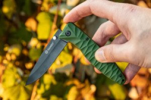 Рукоятка ножа сделана из распространенного материала – высокотехнологичного, термостойкого и нетоксичного ABS-пластика, достоинствами которого являются почти нулевая подверженность воздействию агрессивных веществ и термостойкость. Рукоятка по бокам имеет рифленые пластины, которые позволяют удобно расположить нож в руке и не испытывать дискомфорта при любых погодных условиях. Во время транспортировки нож можно разместить на ремне, используя для этого специально предусмотренную производителем металлическую клипсу.
