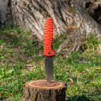Цвет рукоятки покупатель выбирает на свой вкус из трех доступных вариантов: оранжевый, черный или зеленый. В каждом случае, она будет изготовлена из современного композита fiber glass. Это стеклонаполненное волокно с высоким уровнем прочности. Оно тверже обычных пластиков, не обесцвечивается на солнце, не впитывает воду. На одной из сторон рукоятки установлена клипса для страховочного крепления ножа на ремень.