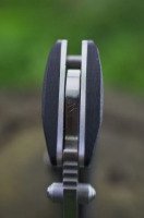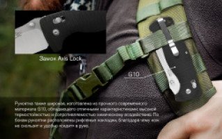 Рукоятка изготовлена из прочного современного материала G10, обладающего отличными характеристиками: высокой термостойкостью и сопротивляемостью химическому воздействию. По бокам рукоятки расположены рифленые накладки, благодаря чему нож не скользит и удобно «сидит» в руке. Также на рукоятке предусмотрена металлическая прижимная клипса, позволяющая разместить нож на ремне при транспортировке.