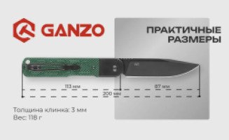 Вес ножа Ganzo G767PT-GB не превышает 118 грамм. Общая длина ножа — 20 см, из которых длина лезвия занимает 8,7 см. Толщина лезвия составляет 3 мм, что позволяет выполнять ножом грубые работы, требующие силовых усилий. Из дополнительных деталей также можно отметить ребристый упор у основания клинка для большого пальца и отверстие в рукоятке для темляка.