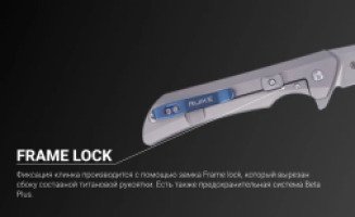 Во время производства сталь прошла криогенную обработку. Высокие спуски лезвия отчасти продублированы на обухе и сведены в ребре к задернутому кончику. Клинок модели вращается на оси с подшипниками и шайбой. Фиксация клинка производится с помощью замка Frame lock, который вырезан сбоку составной титановой рукоятки. Есть также предохранительная система Beta Plus. Рукоять изделия имеет эргономичную форму, за счет которой его удобно удерживать в ладони. Переноска новинки осуществляется при помощи контрастной съемной клипсы пластинчатой конструкции, располагающей клинок кончиком вверх.
