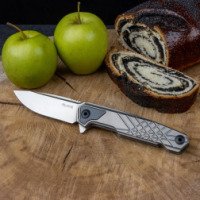 Это складное изделие, форма клинка которого – drop point, полная длина составляет 20,8 сантиметра. Длина клинка достигает 8,9 сантиметра. Ножик сделан с применением премиальной австрийской стали N690Co. Сплав прошел криогенную обработку при производственном процессе. Особенность такой стали – в удачно подобранном химическом составе и высоких стандартах качества. Очень похожа по свойствам на упомянутую N690Co австрийская сталь 440С. Однако в ней массовая доля легирующих элементов (в основном, кобальта и молибдена) куда меньше. Это сказывается на некоторых свойствах: способности закаляться, твердости, пластичности. Твердость стали составляет 58-60 единиц Роквелла, и это вполне хорошо, как для подобного типа инструментов. Экземпляр надежный, прочный, износостойкий, и способен немало лет прослужить своему хозяину. В начале обуха модели присутствуют линейные пропилы для установки пальца при сложной или точной манипуляции. Удобен в применении.