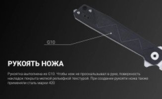 В основе лезвия – нержавеющая сталь 14C28N, закаленная до показателя 58-60 единиц Роквелла. Особенность данного материала заключается в сбалансированном химическом составе, который обеспечивает стали ее высокие эксплуатационные свойства. Хромированная сталь 14C28N используется в производстве профессиональной ножевой продукции, поскольку дает изделиям прочность, остроту и стойкость к ржавчине. Ручка ножа изготовлена с применением стеклотекстолита G10. Это высокопрочный, устойчивый к механическим воздействиям и высокой температуре, материал. Также он хорошо поддается окрашиванию. При наличии G10 нож обретает такие качества, как защищенность от потертостей и царапин, а также способность выдерживать механические нагрузки. При создании рукояти ножа также применяли сталь марки 420. Она довольно распространена, устойчива к коррозии, хотя при этом относительно мягкая.