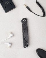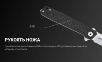 Рукоятка в своей основе имеет стеклотекстолит G10. Материал довольно прочный, устойчивый к повреждениям и высокой температуре. Помимо того, его без труда можно красить в различные цвета. При наличии G10 нож обретает такие качества, как защищенность от потертостей и царапин, а также способность выдерживать механические нагрузки. Рукоять дополнена накладкой из углеродного волокна. При создании рукояти также использовалась сталь марки 420. Она довольно часто встречается. Это защищенная от коррозии сталь, хотя при этом относительно мягкая. С торцевой стороны рукоятки расположен стеклобой из вольфрамовой стали.