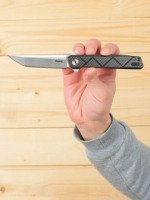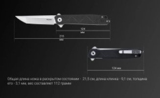 Изделие представляет собой складной нож с прямой рукоятью расцветки «карбон». Ручка модели имеет геометрический рисунок. Общая длина ножа составляет 21,5 сантиметра, вес – 112 грамм. Длина клинка при этом немного превышает 9 сантиметров, а толщина его равна 3,1 миллиметра.