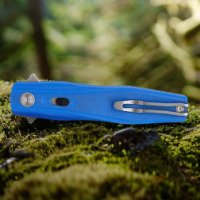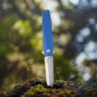 Рукоятка ножа выполнена в синем цвете. Лезвие обладает матовой металлической текстурой, поскольку было отшлифовано при помощи технологии Brushed. Использование крупнозернистого абразива создает на лезвии матовую текстуру и маскирует любые мелкие потертости ножа.