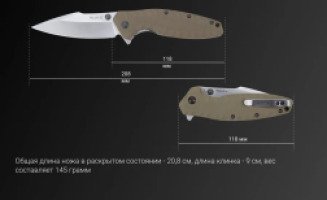 Это складной экземпляр с клинком формы clip-point и рукояткой песочного оттенка. Ручка ножа имеет изогнутую форму, которая удобна для захвата. Весит приспособление 145 грамм, длина его составляет 20,8 сантиметра. Толщина лезвия ножа 3,1 миллиметра, а длина насчитывает 9 сантиметров. В основе клинка – металлический сплав марки 12С27. Это шведская, защищенная от коррозии, сталь, специфика которой заключается в идеально подобранном сочетании химических элементов. Хромированная сталь прошла криогенную обработку. Единство углерода и хрома обеспечивает изделию важнейшие эксплуатационные характеристики. В том числе – стойкость к износу и защиту от коррозии.