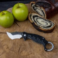 Лезвие ножа имеет длину 75.5 мм, толщина клинка составляет три с половиной миллиметра. Лезвие изготовлено с применением стали марки 14C28N. Сталь прошла при производстве криогенную обработку. Это материал, не подверженный коррозии, от шведской компании Sandvic Stainless. Данная сталь была разработана специально для ножей, твердость ее достигает 55-62 HRC. Твердость модели – 58-60 единиц по шкале Роквелла, что считается весьма приличным показателем. Это надежное приспособление, которое отлично разрезает и выдерживает механические нагрузки без потери эффективности. Рукоятка ножа сделана с использованием материала G10. Его особенность – в прекрасной прочности, водостойкости и устойчивости к повреждениям. Это долговечный материал, за счет наличия подобных ценных качеств его часто применяют при создании ножевой продукции. Также в основе рукояти – нержавеющая сталь 420.