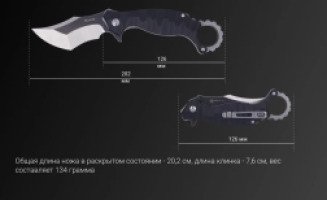 Рукоятка модели выполнена в темно-сером цвете, вес составляет 134 грамма, а полная длина – 20,2 сантиметра. Расцветка неоднородная, с рисунком. Нож обеспечен удобной металлической клипсой, позволяющей цеплять его на одежду либо, к примеру, на рюкзак. Имеет круглый подшипник и замок по типу Liner lock, предохраняющий модель от случайного открытия либо непреднамеренного закрытия. Это очень безопасный и надежный механизм, который значительно упростил использование ножей. В результате открывать и закрывать модель можно буквально одной рукой.