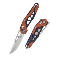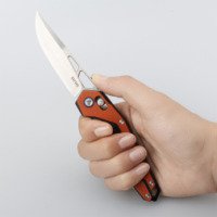 Рукоять выполнена из прочного G10 оранжевого цвета с текстурой, обеспечивающей уверенный и удобный хват в любых условиях. Эргономичная рукоять делает нож SRM Mecha удобным для повседневных задач — от резки упаковок до работ на природе. Благодаря компактным размерам и весу около 82 г этот надёжный складной нож легко носить с собой каждый день и брать с собой в походы, путешествия или на отдых.