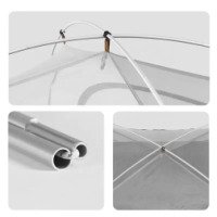 Каркас изготовлен из прочного алюминия. Крестообразная конструкция надежно держит форму, поэтому палатка не шатается даже в ветреную погоду. Чуть закругленные части каркаса увеличивают место в палатке, поднимая высоту потолка на несколько сантиметров. Двухслойный тент из полиэстера 210T надежно защищает от сквозняков и дождливой погоды. Сетчатый тент, который выступает в качестве подкладки и москитной сетки, можно использовать отдельно от верхнего слоя. В теплую погоду это добавит особую атмосферу в путешествие и позволит отдыхать под открытым небом.