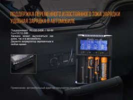 Модель Fenix ARE-A4 подойдет как для зарядки аккумуляторов дома, так и для путешествий. Это компактное устройство весом 265 г, которое в состоянии работать от обычной электросети с напряжением 220В и от аккумулятора, установленного в автомобиле. Кабель для подключения к электросети есть в комплекте, а вот второй нужно покупать отдельно. Но главное преимущество этой модели состоит в ее универсальности по отношению к форматам аккумуляторов. Fenix ARE-A4 одинаково хорошо работает с никель-металлгидридными, литий-ионными и никель-кадмиевыми элементами питания. Совместимыми с этим зарядным устройством являются 9 разновидностей аккумуляторов: АА, 14500, ААА, 10440, С, 26650, 18650, 21700, 16340.