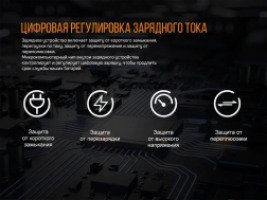 Fenix ARE-D1 в состоянии работать с литий-ионными аккумуляторами и моделями на основе никеля: никель-металлгидридными и никель-кадмиевыми. Это такие 9 типоразмеров: АА, ААА, С, 14500, 18650, 10440, 16340, 21700, 26650. Каждый из аккумуляторов, несмотря на различия в размере, надежно фиксируется внутри слота за счет подвижной прижимной пластины. Зарядное устройство самостоятельно определит после установки аккумулятора его тип, оценит текущий уровень заряда, напряжение.